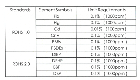 除了檢查這四種有害重金屬元素外還需檢測溴化阻燃劑(多溴聯苯PBB/多溴二苯醚PBDE),同時對不同材質的包裝材料也需要分別進行包裝材料重金屬的測試(94/62/EEC) 達到Rohs2.0